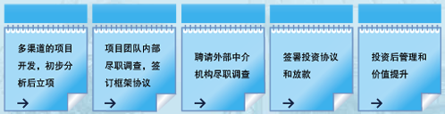 為(wèi)擴大(dà)項目來(lái)源,提高(gāo)投資項目質量和(hé)防範投資風(fēng)險,參考國(guó)際通(tōng)行(xíng)的(de)♠做(zuò)法,并結合中國(guó)本土(tǔ)化(huà)的(de)市(shì)場(chǎng)環境,管理(lǐ)公司制(zhì)定了(le)規範嚴格的(de)投資流程",主要(yào)包括項目開(kāi)發、盡職調查、交易談判、投資決策、投資後管理(lǐ)、項目退出等環節。